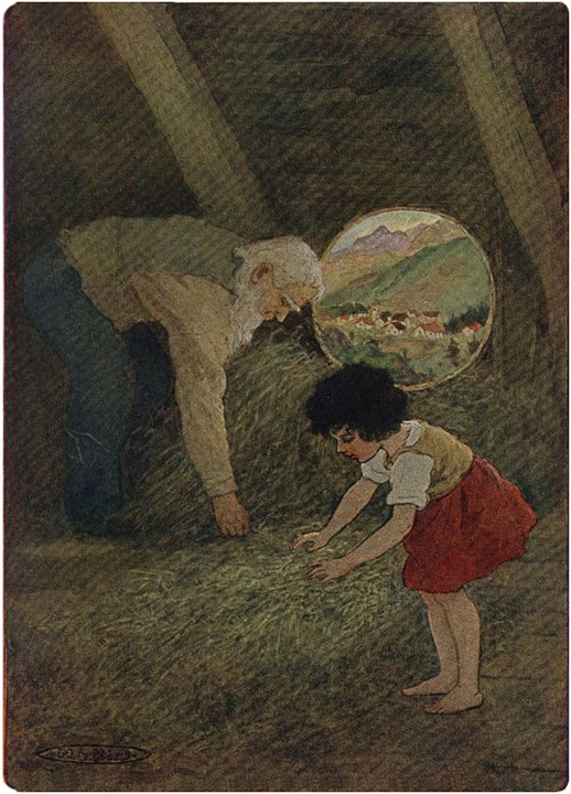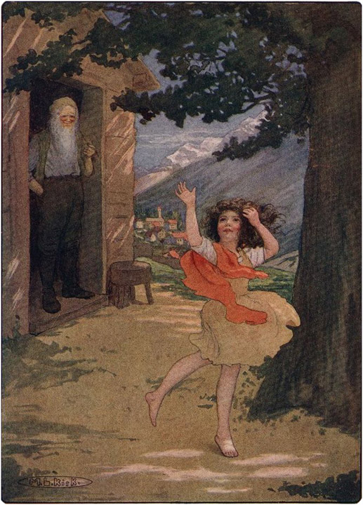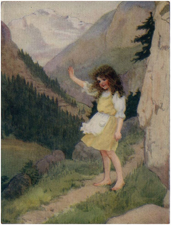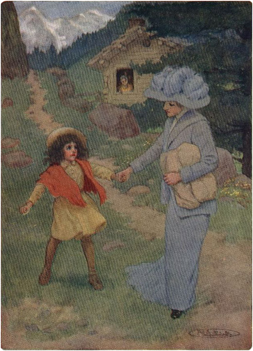 The pair had been climbing for about an hour when they reached a hamlet half-way up the great mountain named the Alm. This hamlet was called "Im Dörfli" or "The Little Village." It was the elder girl's home town, and therefore she was greeted from nearly every house; people called to her from windows and doors, and very often from the road. But, answering questions and calls as she went by, the girl did not loiter on her way and only stood still when she reached the end of the hamlet. There a few cottages lay scattered about, from the furthest of which a voice called out to her through an open door: "Deta, [19]please wait one moment! I am coming with you, if you are going further up."