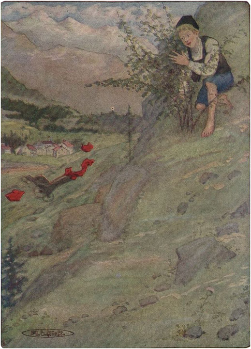 Peter regained his feet and slunk away. How did the baker know the chair had been pushed? He longed to go home to bed and hide, for there alone he felt safe. But he [300]had to go up to the goats, and the uncle had clearly told him to come back as quickly as he could. Groaning, he limped away up to the Alp. How could he run now, with his fear and all his poor, sore limbs?
