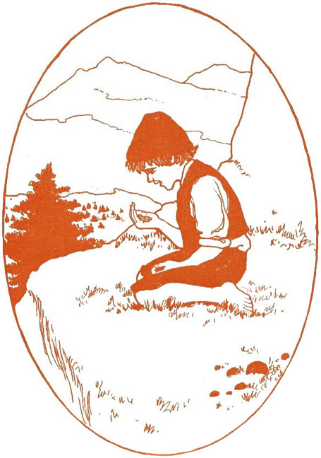 At that moment a rustle was heard, and they saw Peter, who was trying to sneak up behind the trees to avoid the hut. Immediately the old lady called to him, for she thought that Peter himself had picked [303]the flowers for her. He must be creeping away out of sheer modesty, the kind lady thought. To give him his reward, she called: